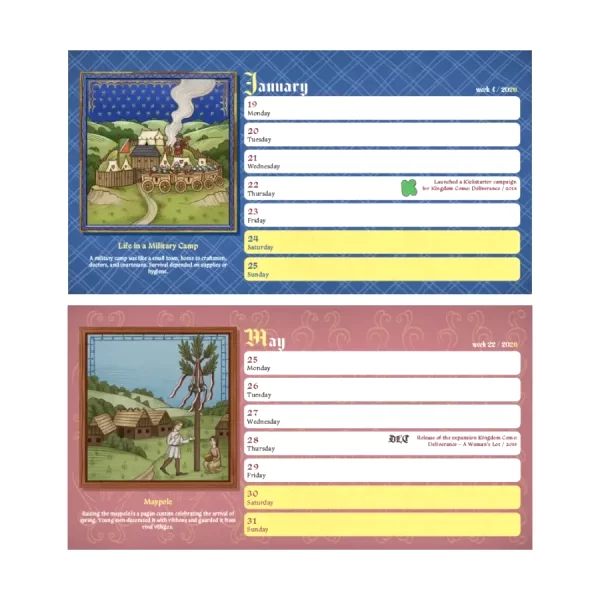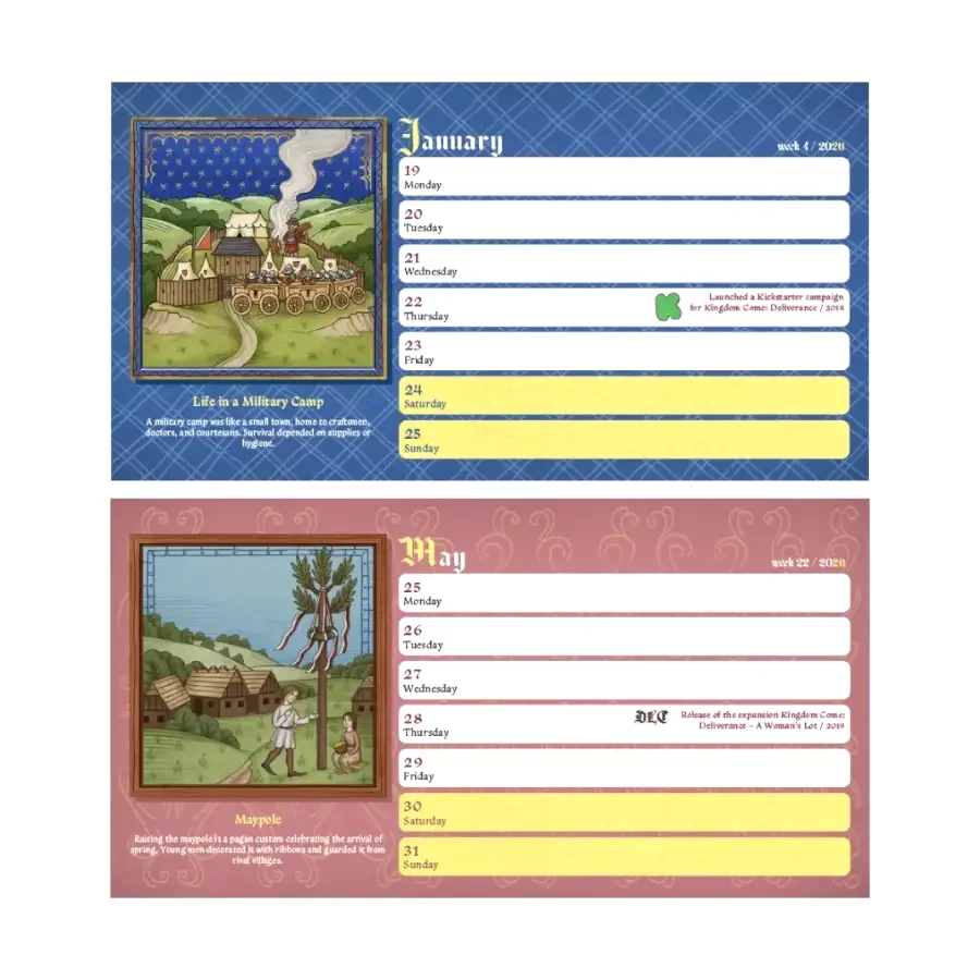 Masz w otoczeniu kogoś, kto ciągle zapomina o urodzinach lub rocznicach? W takim razie kalendarze Kingdom Come: Deliverance II są stworzone właśnie dla nich. Kalendarz ścienny każdego miesiąca odkrywa nową ilustrację ze świata gry, utrzymując średniowieczny klimat we wnętrzu przez cały rok. Z kolei wariant biurkowy co tydzień urozmaici miejsce pracy grafikami z kodeksu gry i ciekawostkami o życiu w średniowiecznych Czechach. Oba kalendarze to doskonały wybór pod choinkę dla każdego fana Kingdom Come: Deliverance II, który będzie cieszył oko przez kolejne 12 miesięcy.