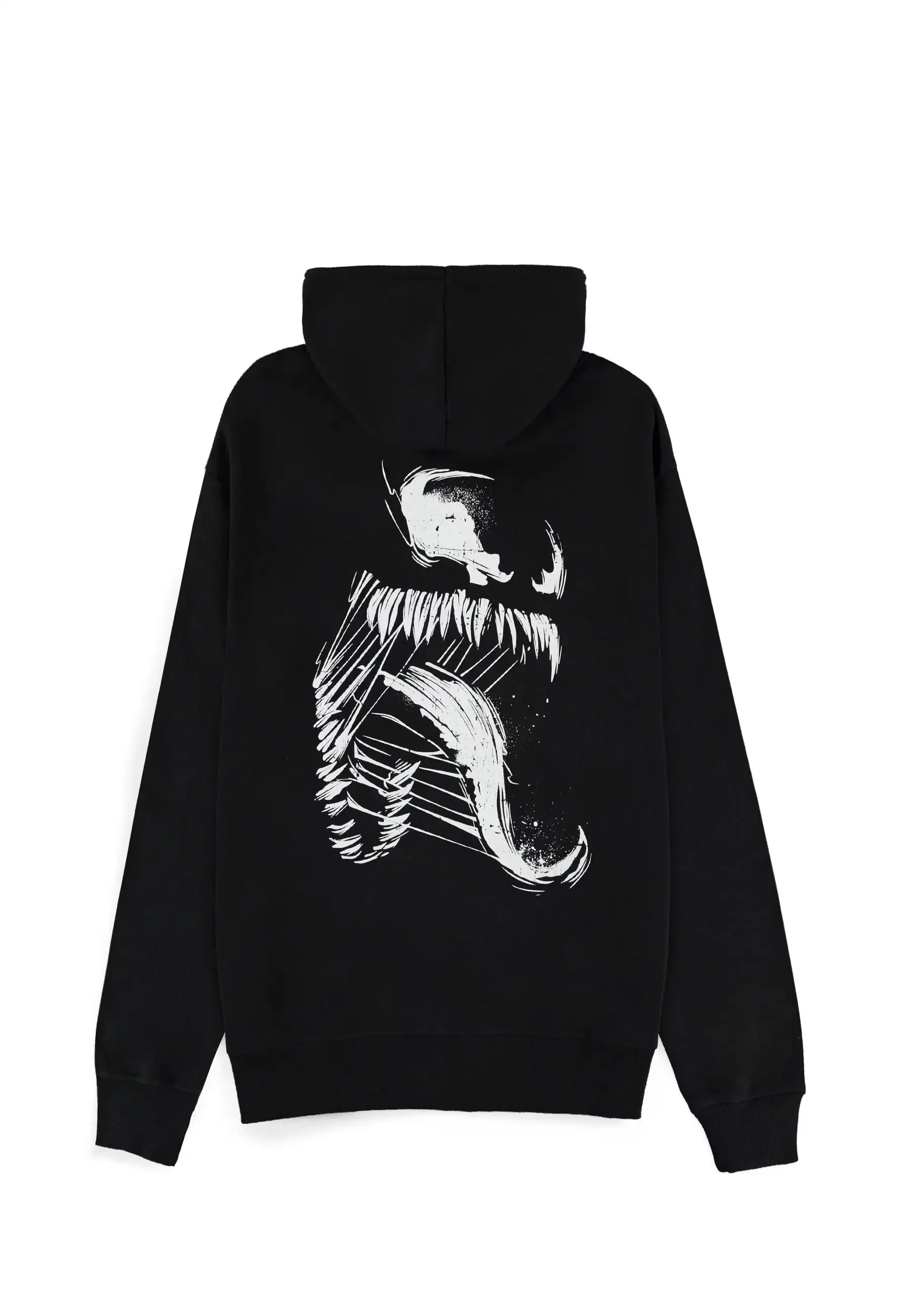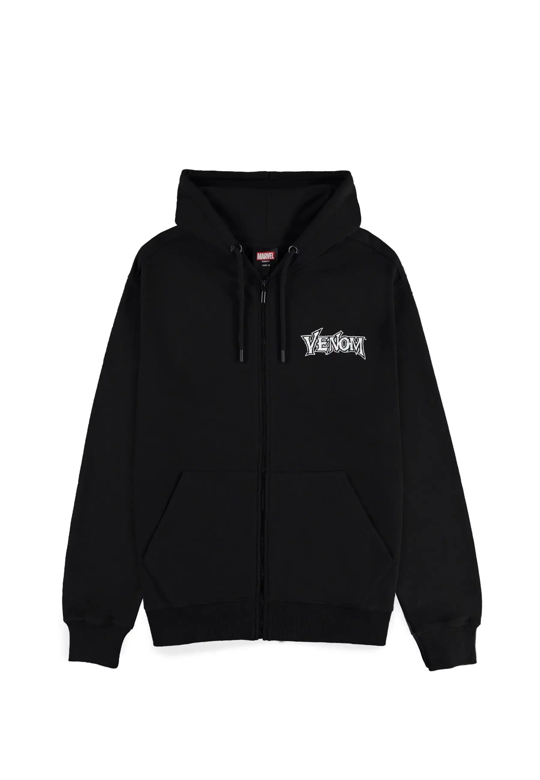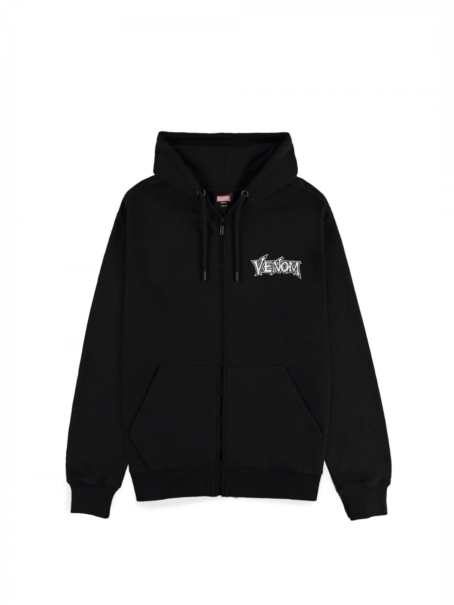 Czarna bluza Marvel - Venom z kapturem i zamkiem przykuwa uwagę subtelnym logo na piersi i kultowym nadrukiem z otwartą paszczą symbionta na plecach.