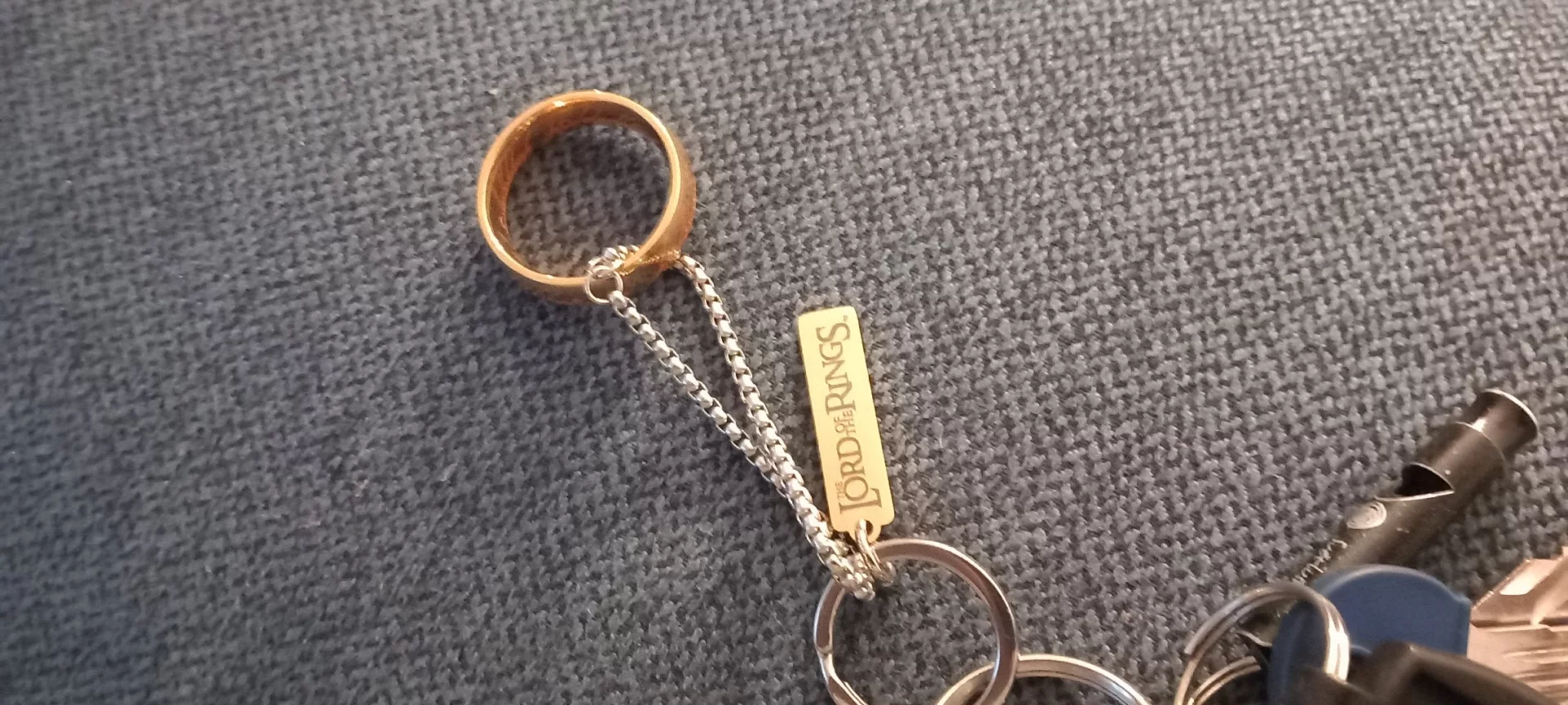 Stylowy pierścień z popularnej serii filmowej Władca Pierścieni z fosforyzującym napisem, który po naświetleniu świeci w ciemności. Idealny do kluczy lub plecaka.