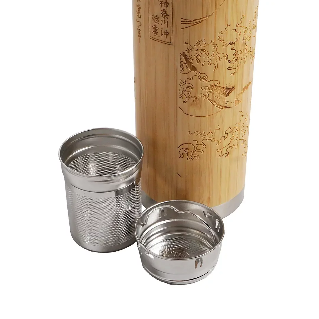 Elegancka bambusowa butelka z delikatnie wygrawerowanym motywem słynnego dzieła The Great Wave off Kanagawa autorstwa Hokusaia jest idealna dla miłośników herbaty i sztuki.