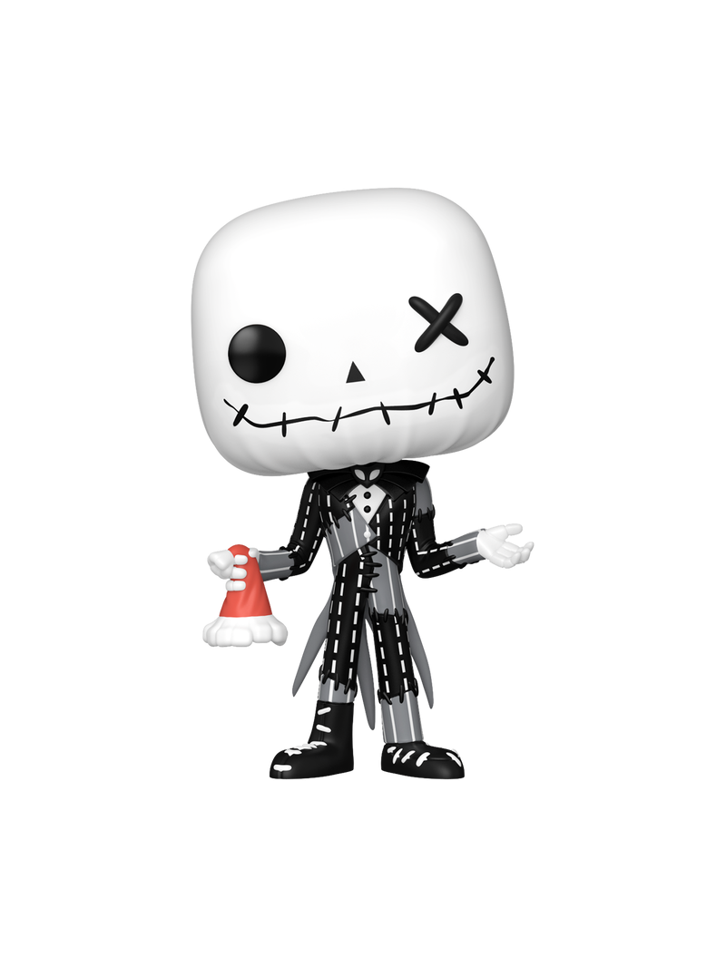 Figurka Funko POP! Jacka Skellingtona z filmu Miasteczko Halloween przedstawia legendarnego Króla Dyni w jego charakterystycznym garniturze w paski, tym razem z czapką Mikołaja w dłoni.