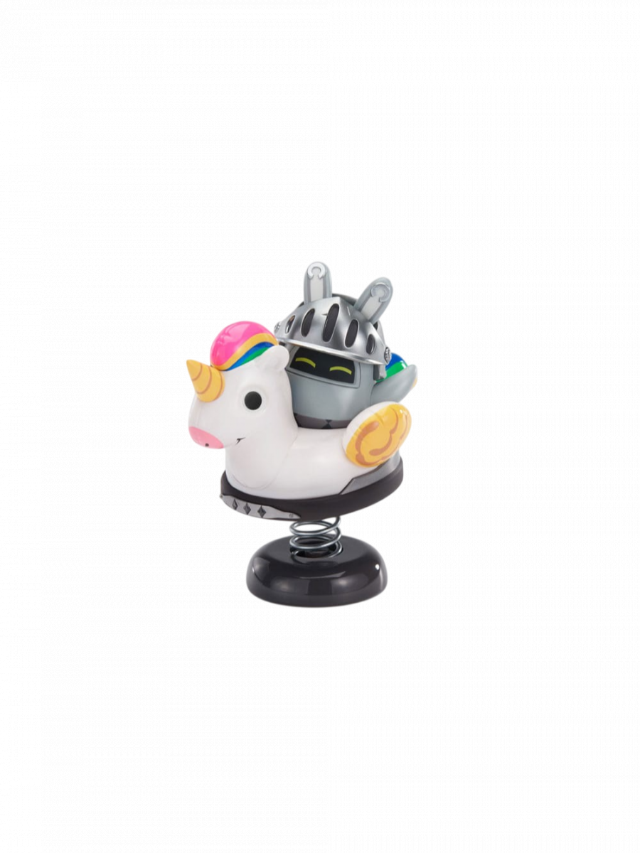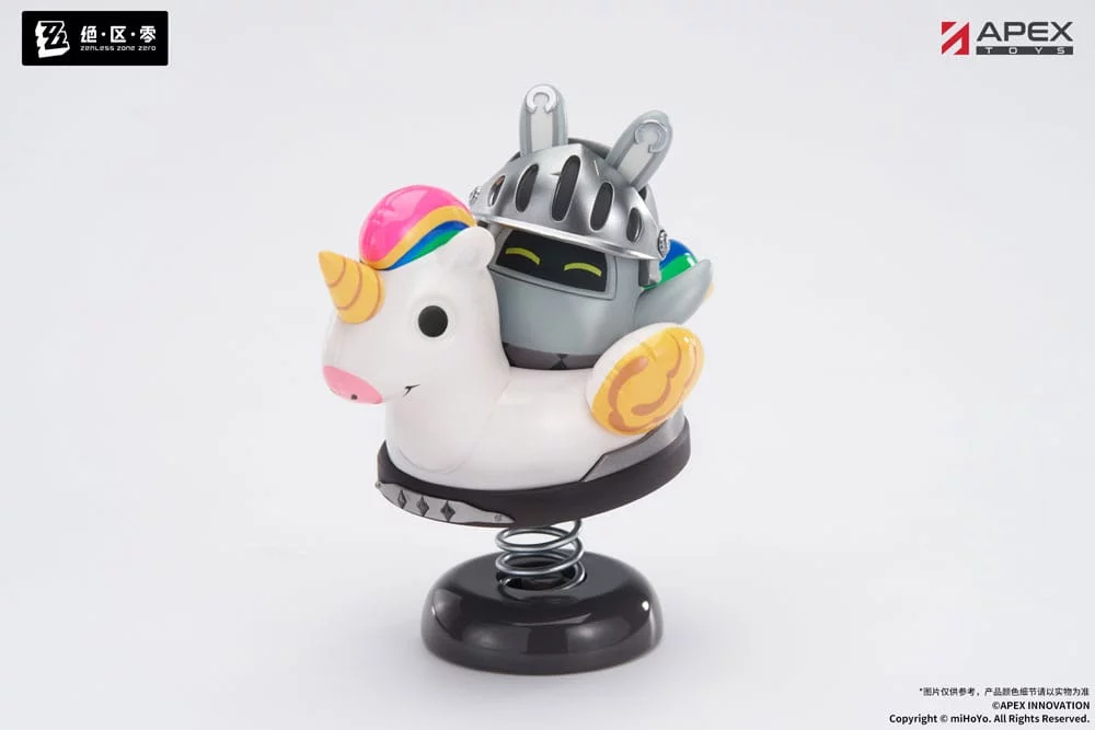 Zabawna figurka Knightboo z Zenless Zone Zero w edycji Happy Shake to mieszanka uroku i humoru. Rycerz w hełmie cieszy się przejażdżką na dmuchanym jednorożcu, a dzięki sprężynowej podstawie uroczo się kołysze przy dotknięciu.