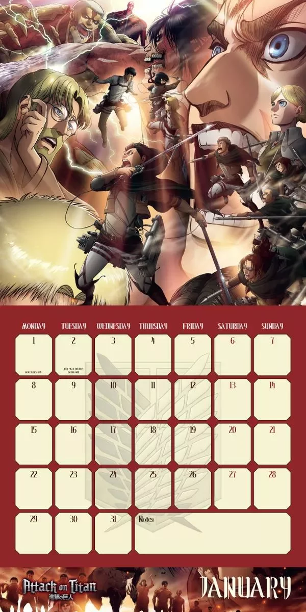 Kwadratowy kalendarz na rok 2024 dla fanów mangi i anime Attack On Titan. Kalendarz naścienny z dużymi panelami miesięcznymi i miejscem na notatki.