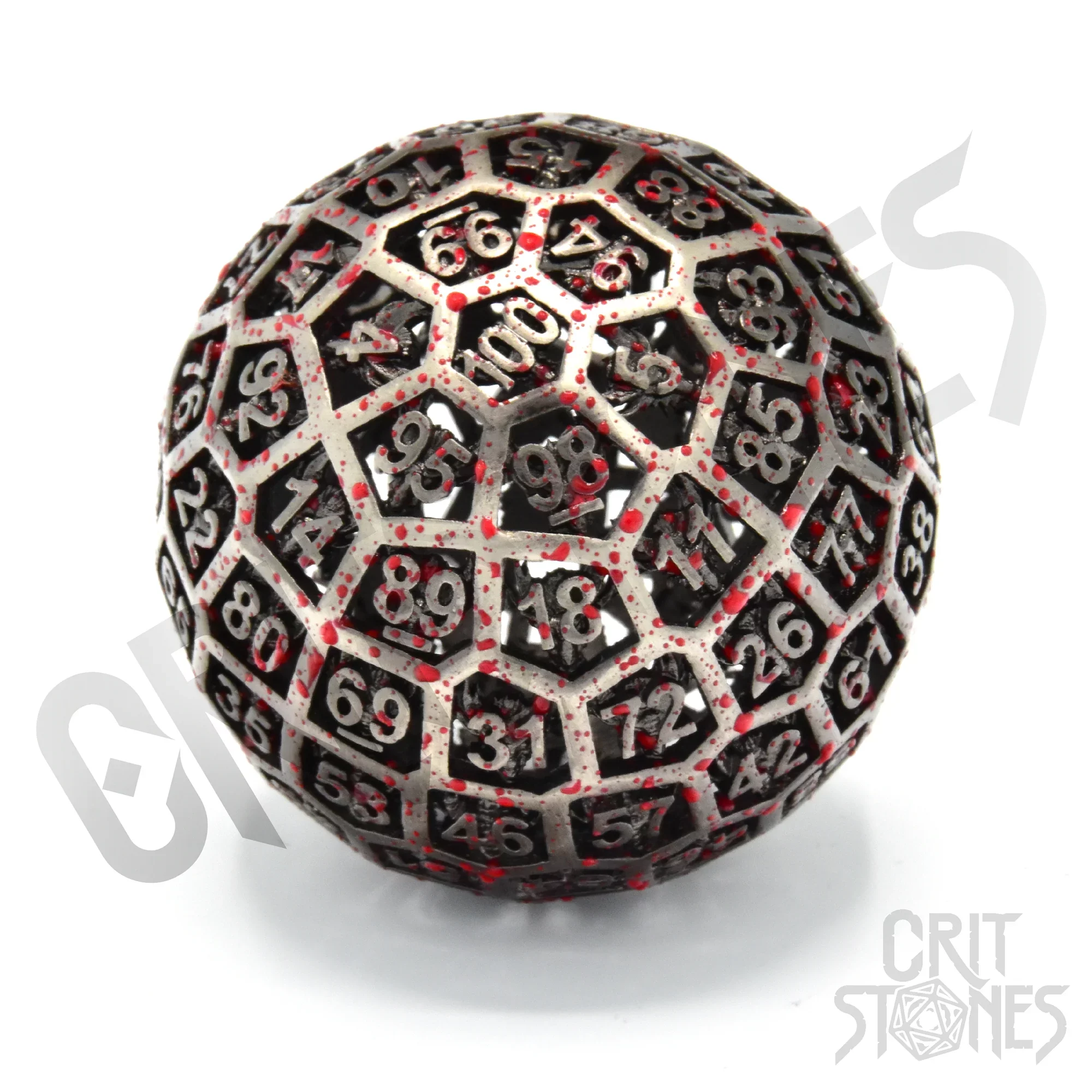 Centigrave Hollow Metal to pusta w środku metalowa kość D100, której szczegółowa konstrukcja i krwistoczerwone detale czynią z niej prawdziwe arcydzieło. Każda cyfra jest precyzyjnie wycięta i gwarantuje płynny, lecz stanowczy rzut.