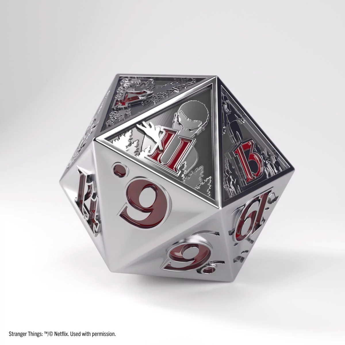 Kostka o średnicy 27 mm przyciąga wzrok detalami w postaci rycin symboli i scen z serialu, które zostały podkreślone kontrastowym czerwonym kolorem. Jest idealna do gier RPG, gier planszowych lub jako wyjątkowy kolekcjonerski artefakt ze świata Drugiej Strony (Upside Down).Materiał: metal -