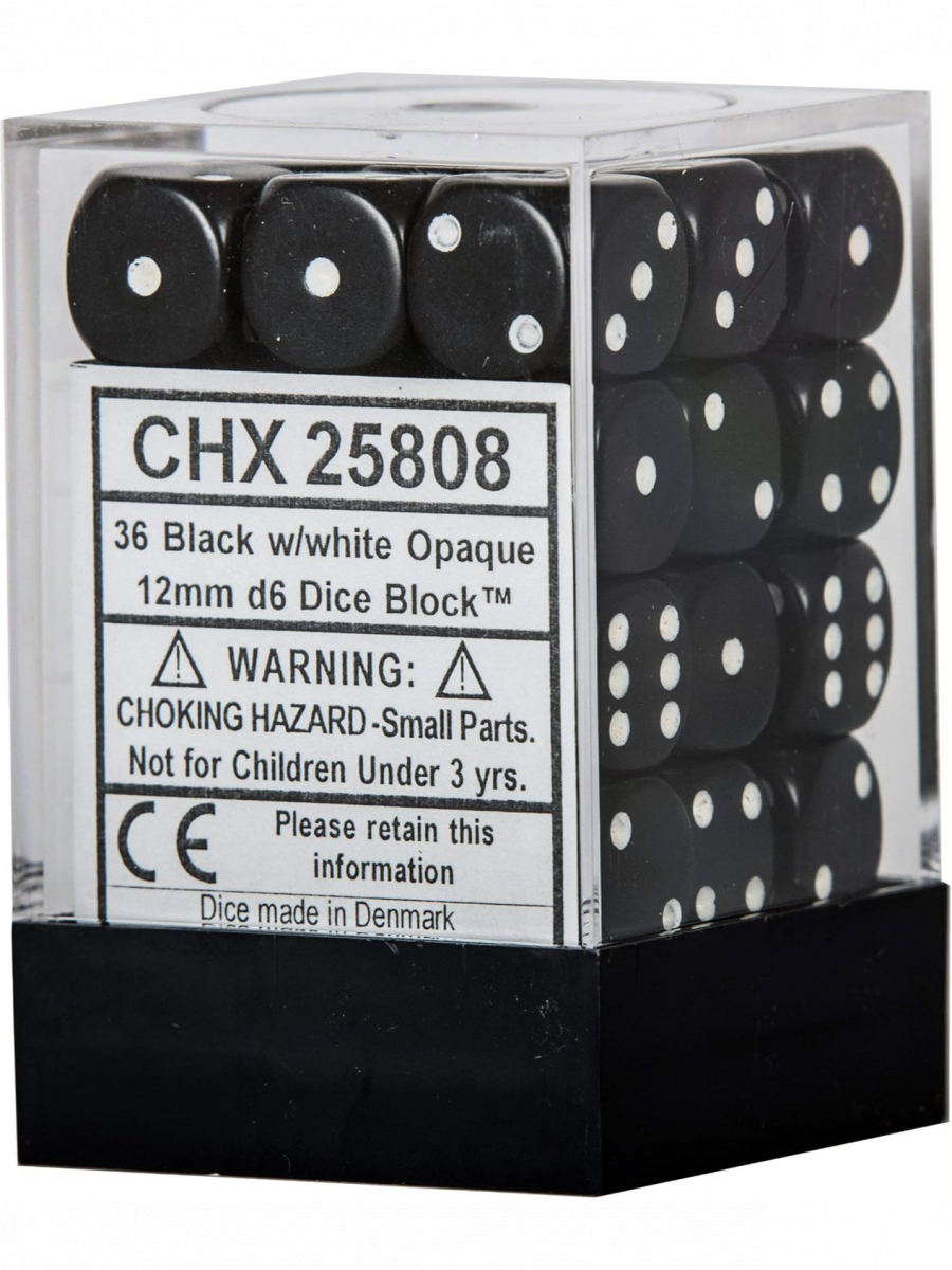 Zestaw sześciennych kości Chessex Opaque - Black (36 szt.) w eleganckim czarnym kolorze z białymi kropkami jest idealny do gier stołowych i planszowych.