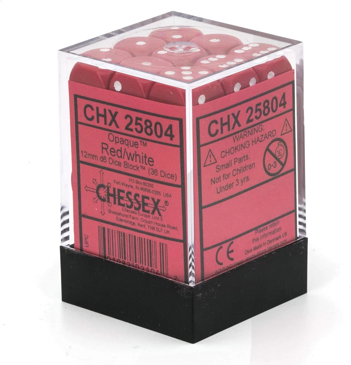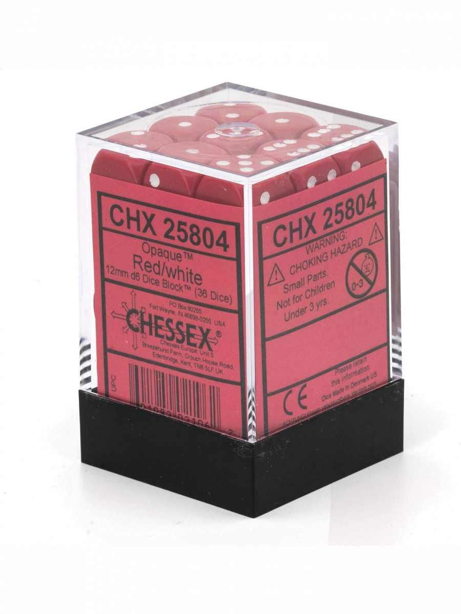 Zestaw sześciennych kości Chessex Opaque - Red (36 szt.) w klasycznym czerwonym wydaniu z białymi kropkami zapewnia świetną widoczność i elegancki kontrast.