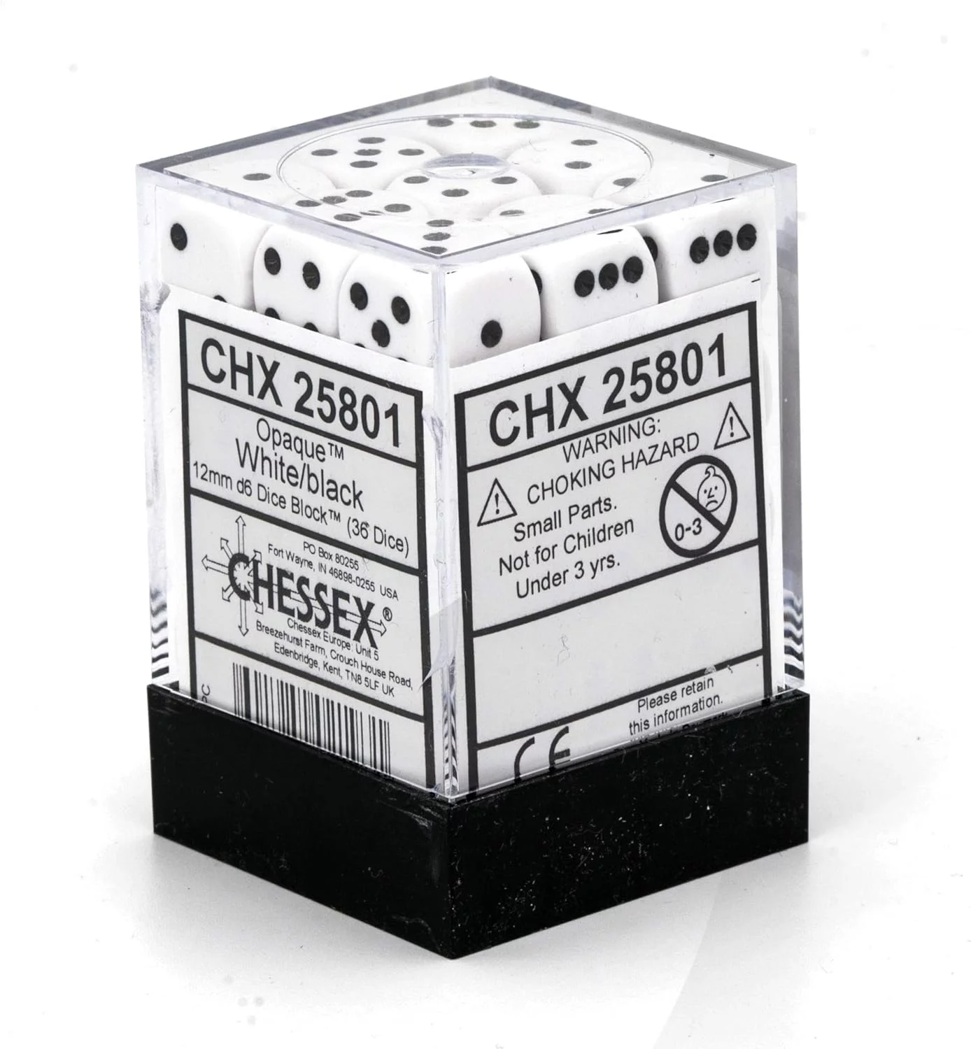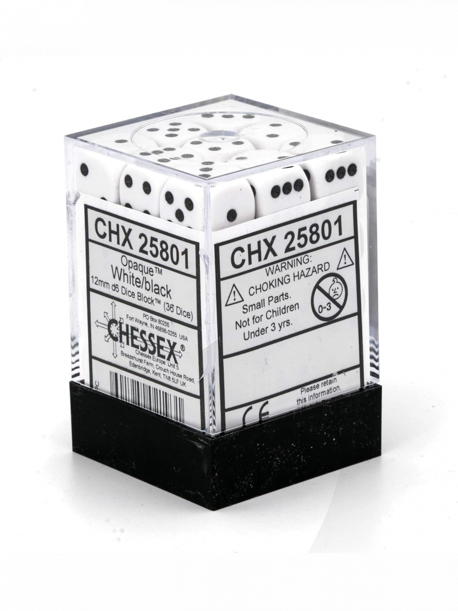 Zestaw sześciennych kości Chessex Opaque - White (36 szt.) w klasycznym czerwonym wydaniu z białymi kropkami zapewnia świetną widoczność i elegancki kontrast.