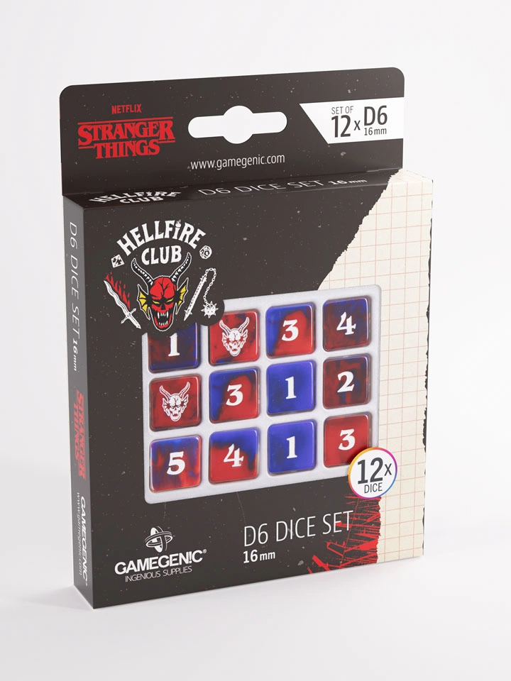 Wysokiej jakości zestaw kości Hellfire Club D6 Dice Set od Gamegenic to idealny dodatek dla każdego fana Stranger Things. Oficjalnie licencjonowane kości sześcienne przyciągają wzrok unikalnym designem w kultowych kolorach czerwonym i niebieskim, tworząc wyrazisty efekt inspirowany światem Upside Down.