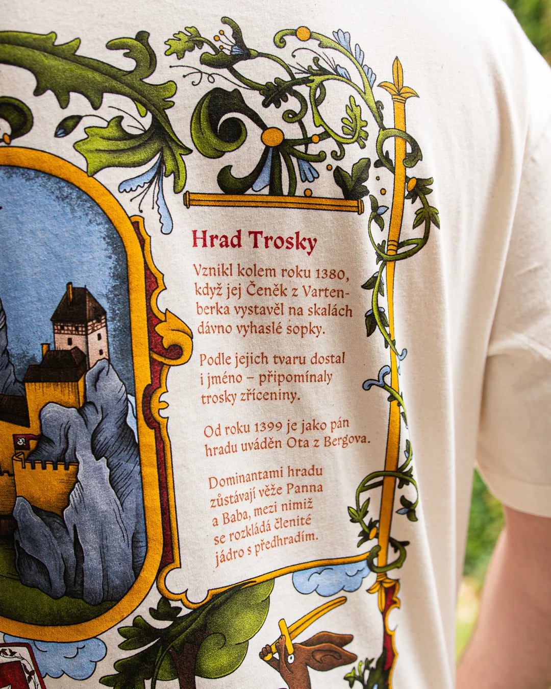 Przenieś się do serca Czeskiego Raju z koszulką inspirowaną legendarnym zamkiem Trosky. Iluminowany motyw przypominający średniowieczne manuskrypty ukazuje piękno i historię tej kultowej ruiny, która ożywa w świecie Kingdom Come: Deliverance II.