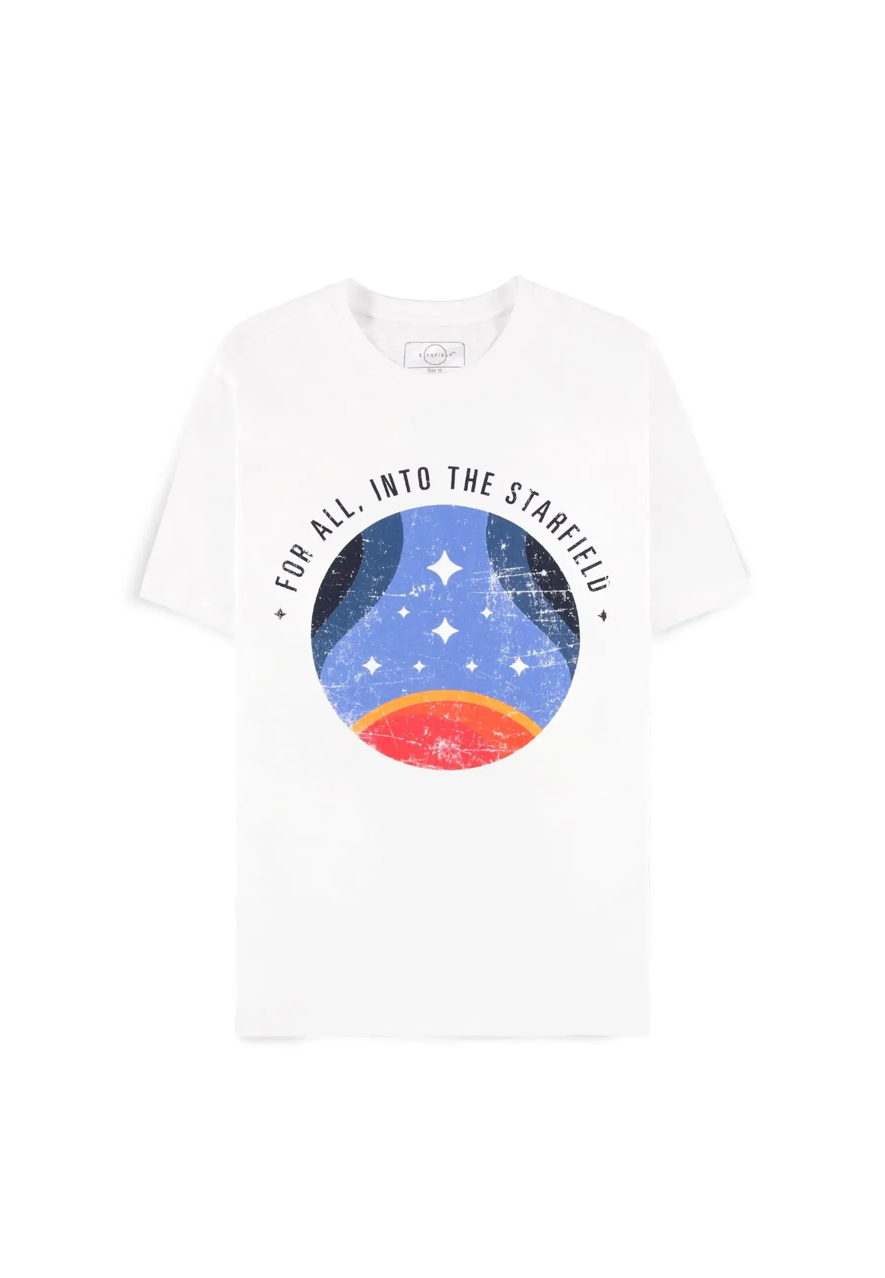 Minimalistyczna biała koszulka inspirowana grą Starfield wprowadza do Twojej garderoby nutę kosmicznej przygody.