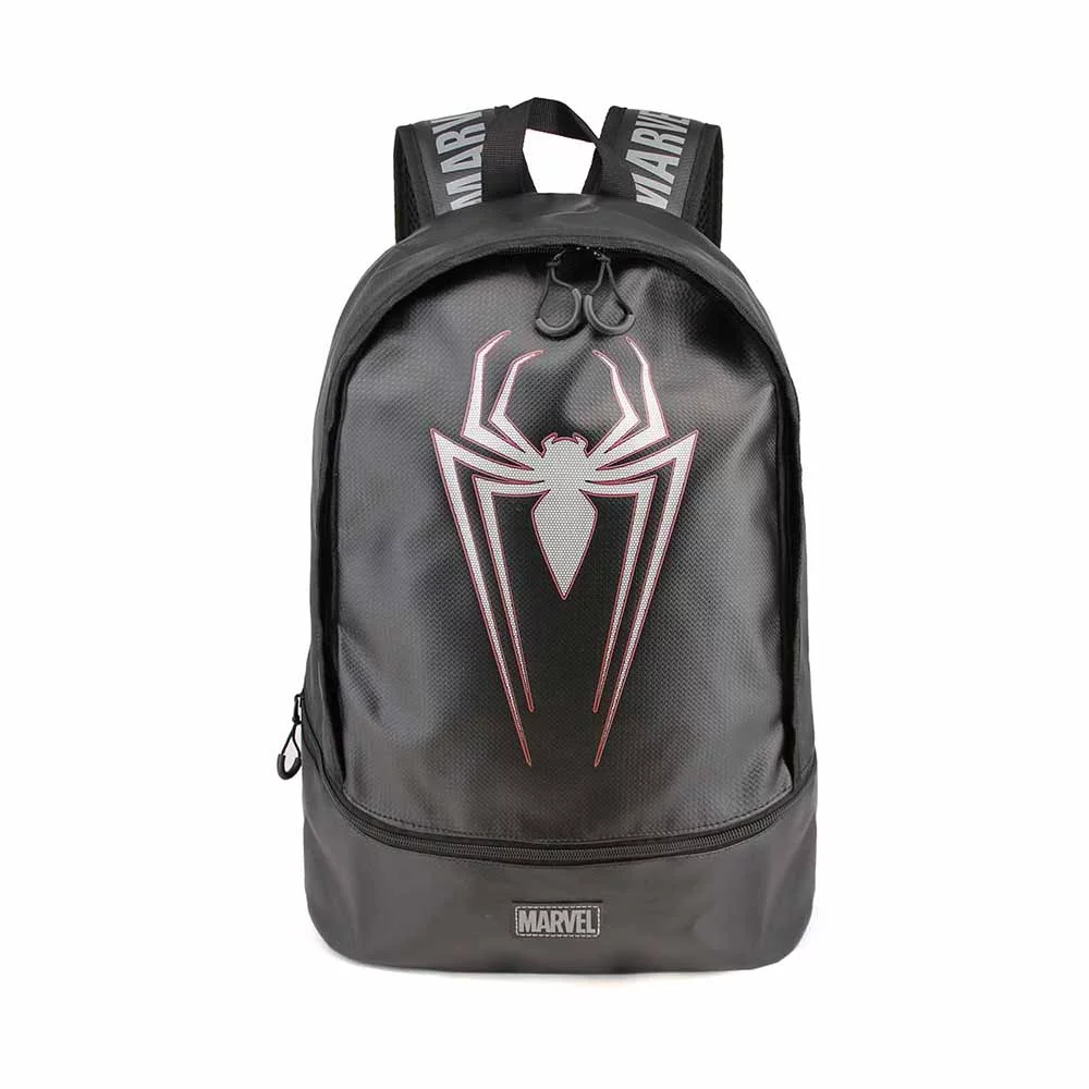 Marvel Plecak Spiderman Poison - Plecak dla fanów Spidermana z dużym logo pająka pośrodku czarnego tła. Plecak ma wyściełany i oddychający tył oraz wyściełane szelki z logo Marvela. Wnętrze zawiera komorę na laptopa i tablet oraz wiele innych mniejszych przegródek. Port USB do ładowania telefonu komórkowego przez power bank (power bank nie jest dołączony do zestawu).