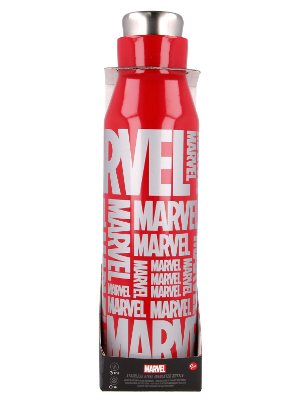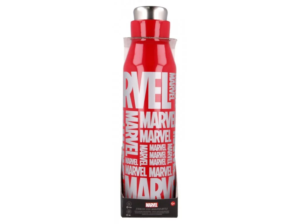 Marvel termos - Wysokiej jakości butelka ze stali nierdzewnej do utrzymywania zimnych / gorących napojów w stałej temperaturze. Ten termos o pojemności 580 ml jest tematycznie związany z firmą Marvel Comics. Logo Marvel kilkukrotnie na czerwonym tle.