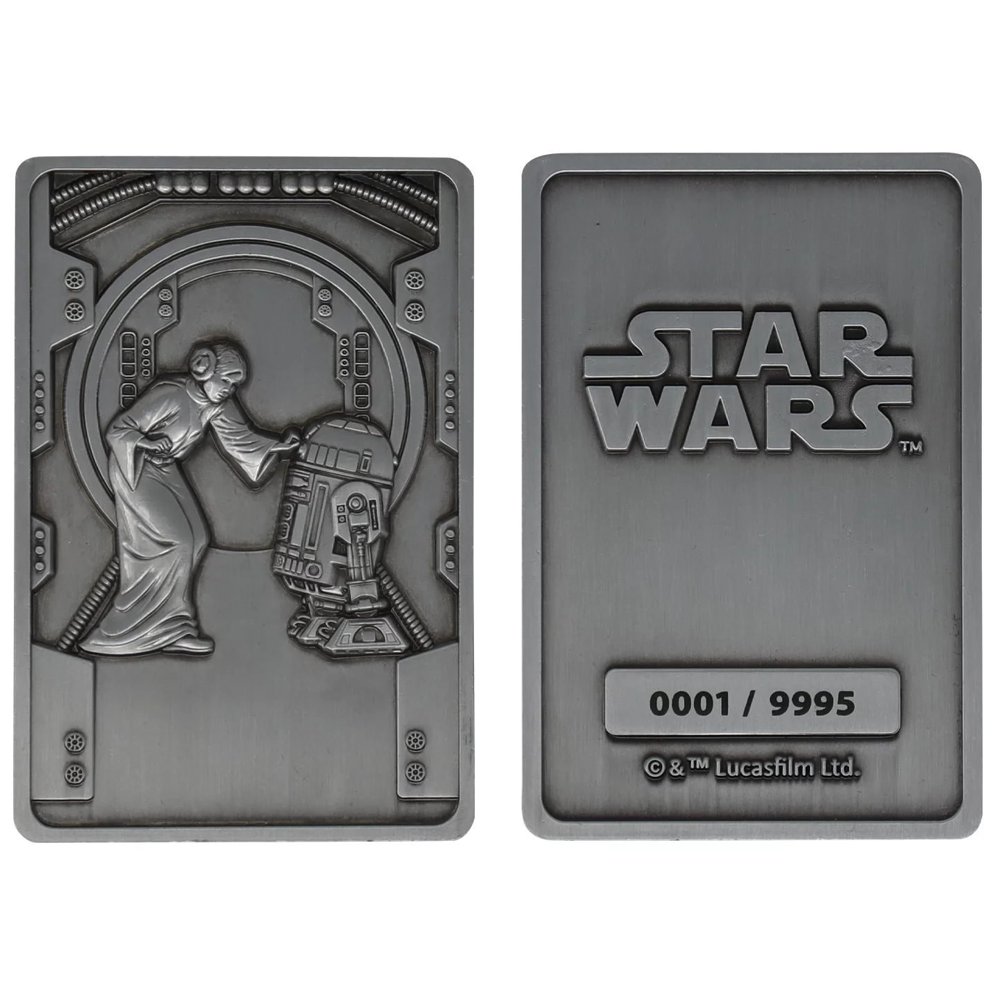Uchwycono jeden z najbardziej kultowych momentów całej sagi, a ta kolekcjonerska plakieta przenosi go bezpośrednio do Twojej gabloty. Metalowa plakieta Star Wars My Only Hope Ingot przedstawia księżniczkę Leię przekazującą wiadomość wiernemu droidowi R2-D2 w przepięknym reliefie z subtelnie dopracowanymi detalami.