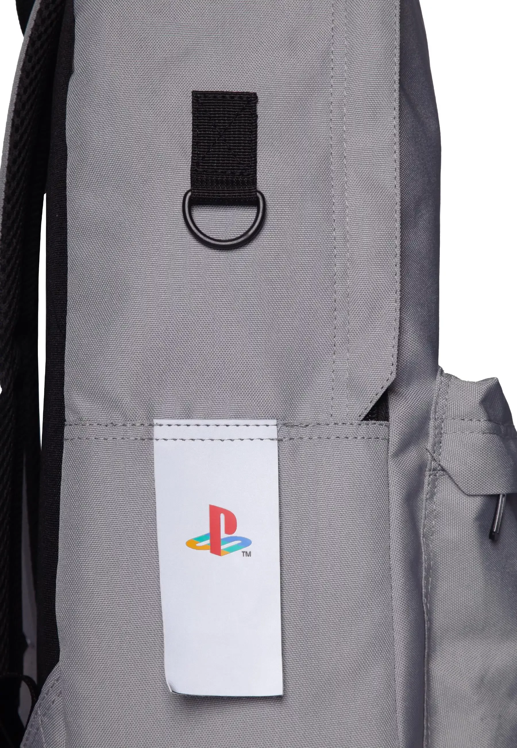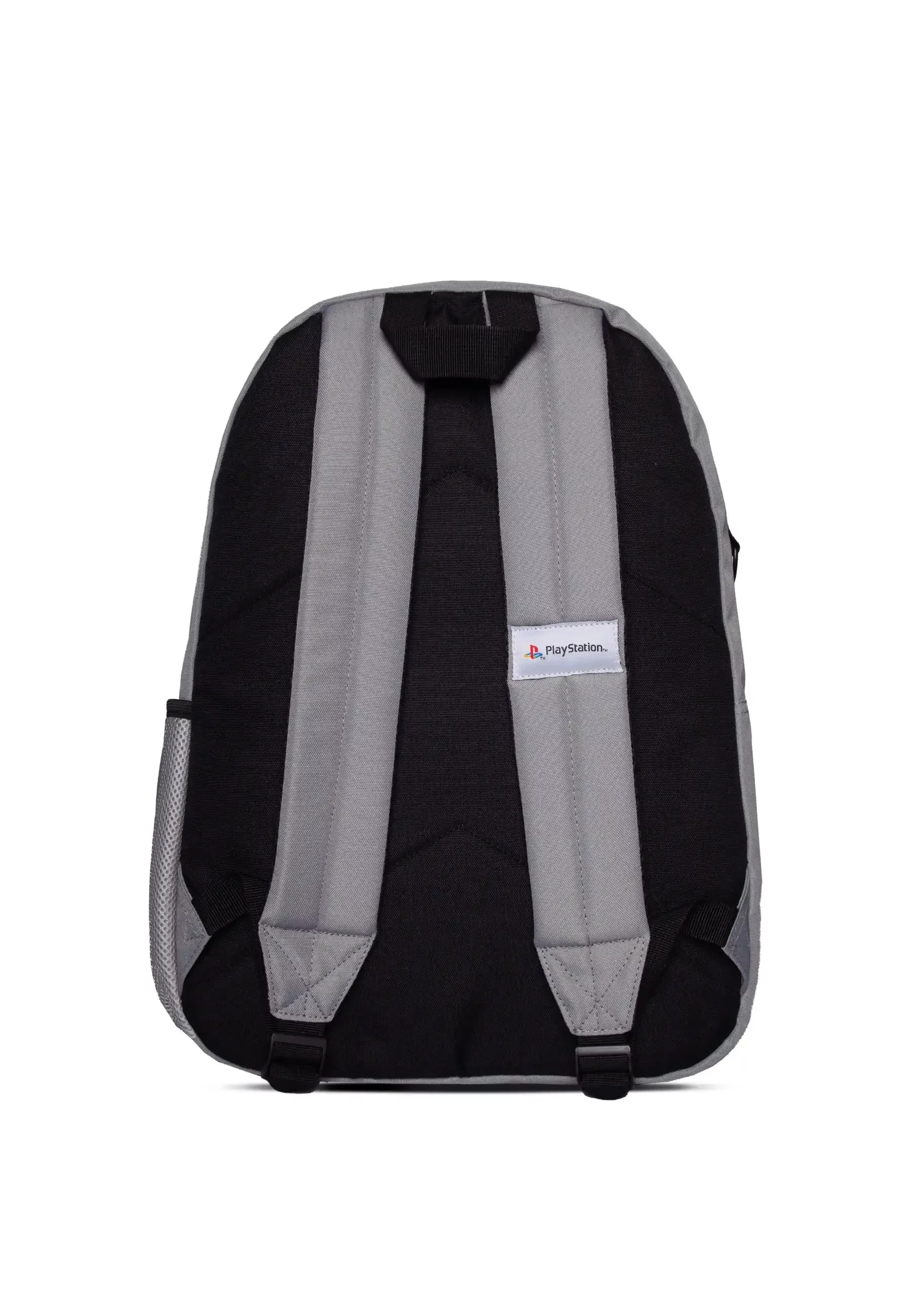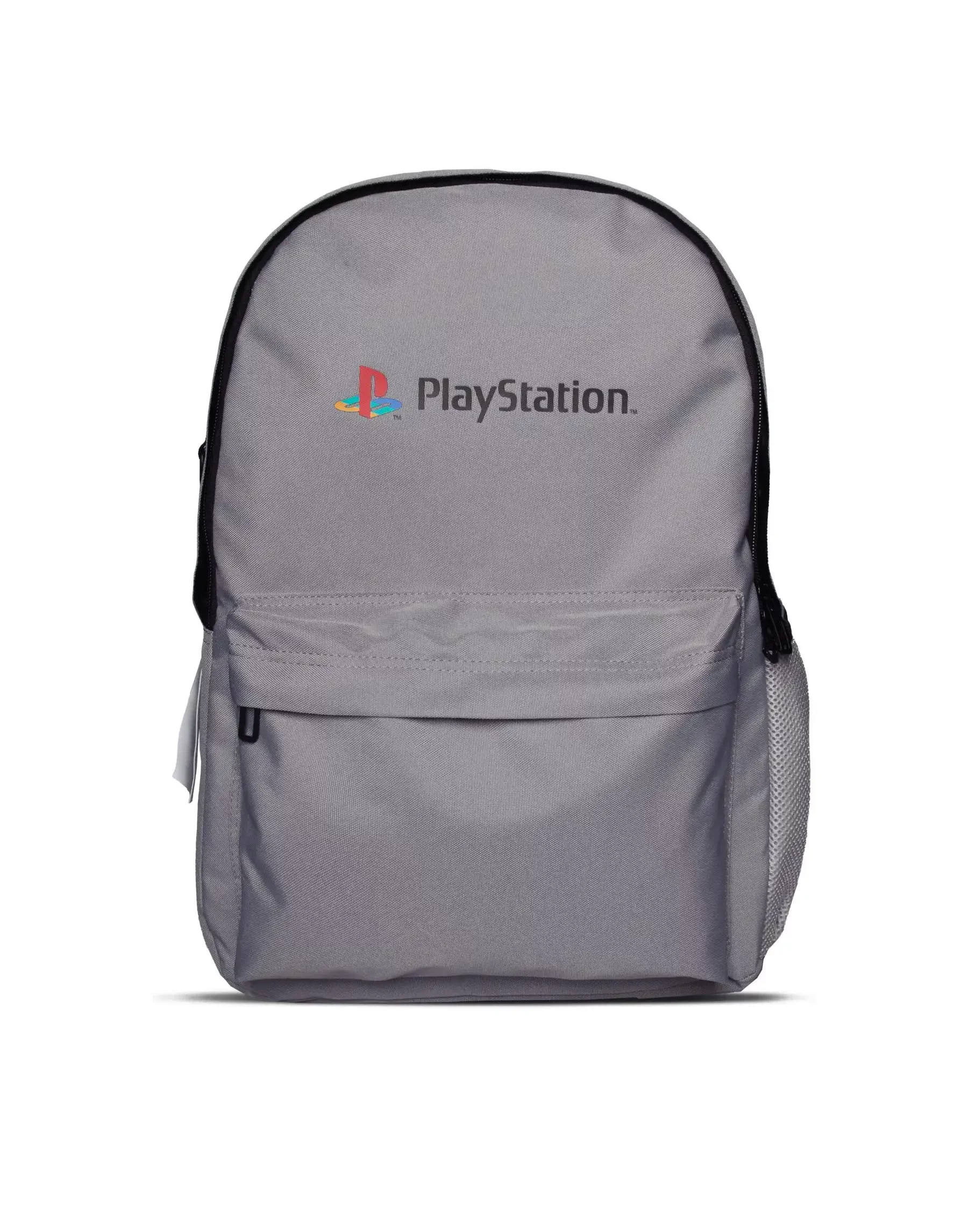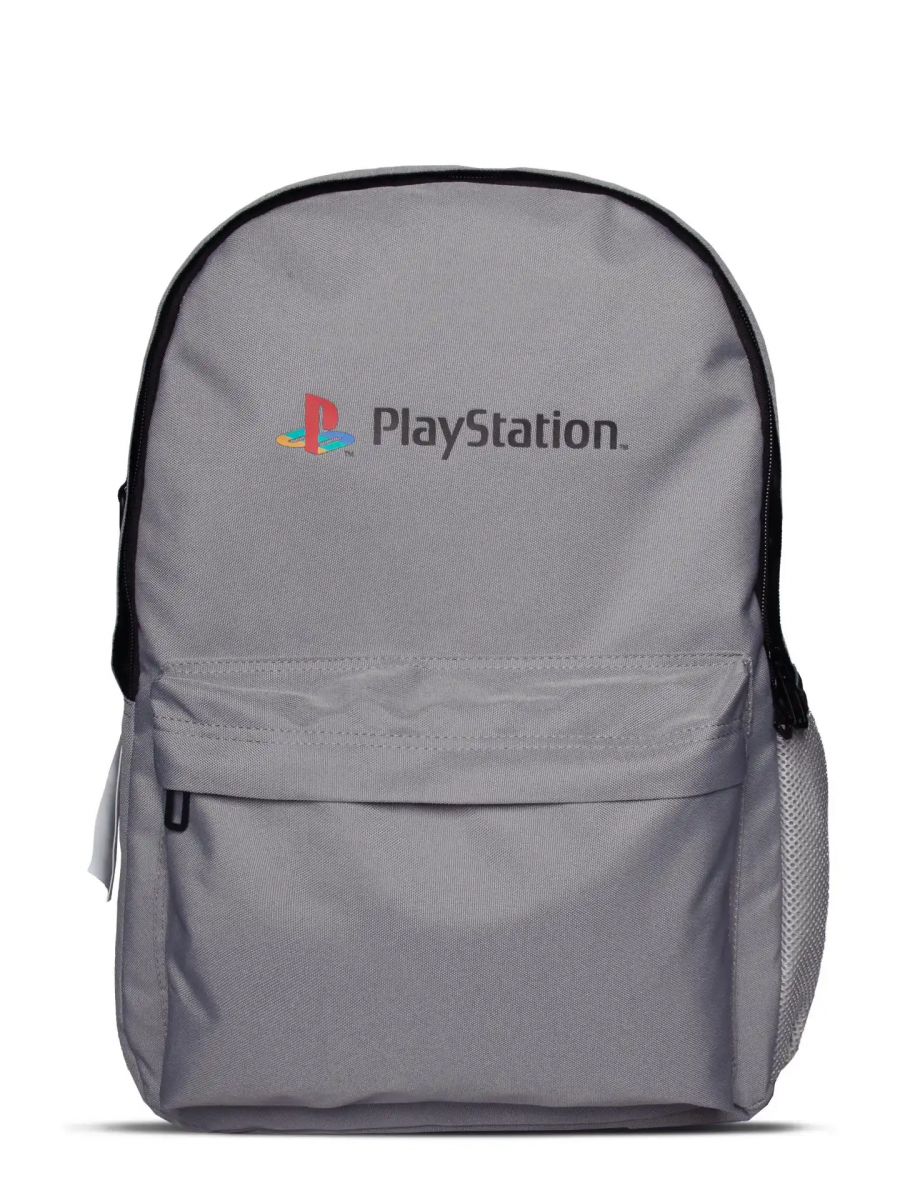 Plecak PlayStation - Logo w minimalistycznym szarym designie z kultowym kolorowym logo przypomina złotą erę gier. Oferuje pojemną komorę główną, przednią przegrodę na drobiazgi oraz boczną siateczkową kieszeń na butelkę.
