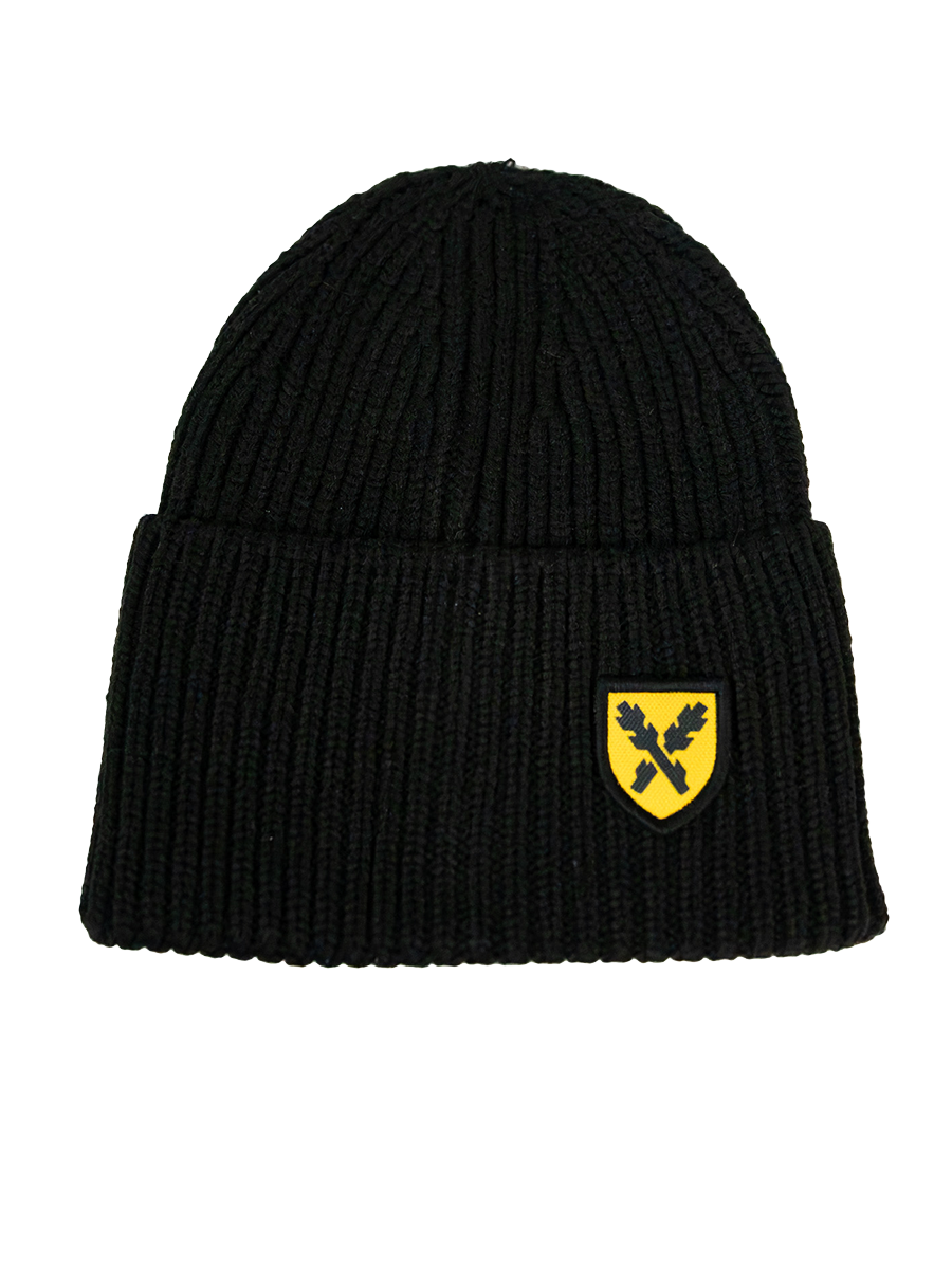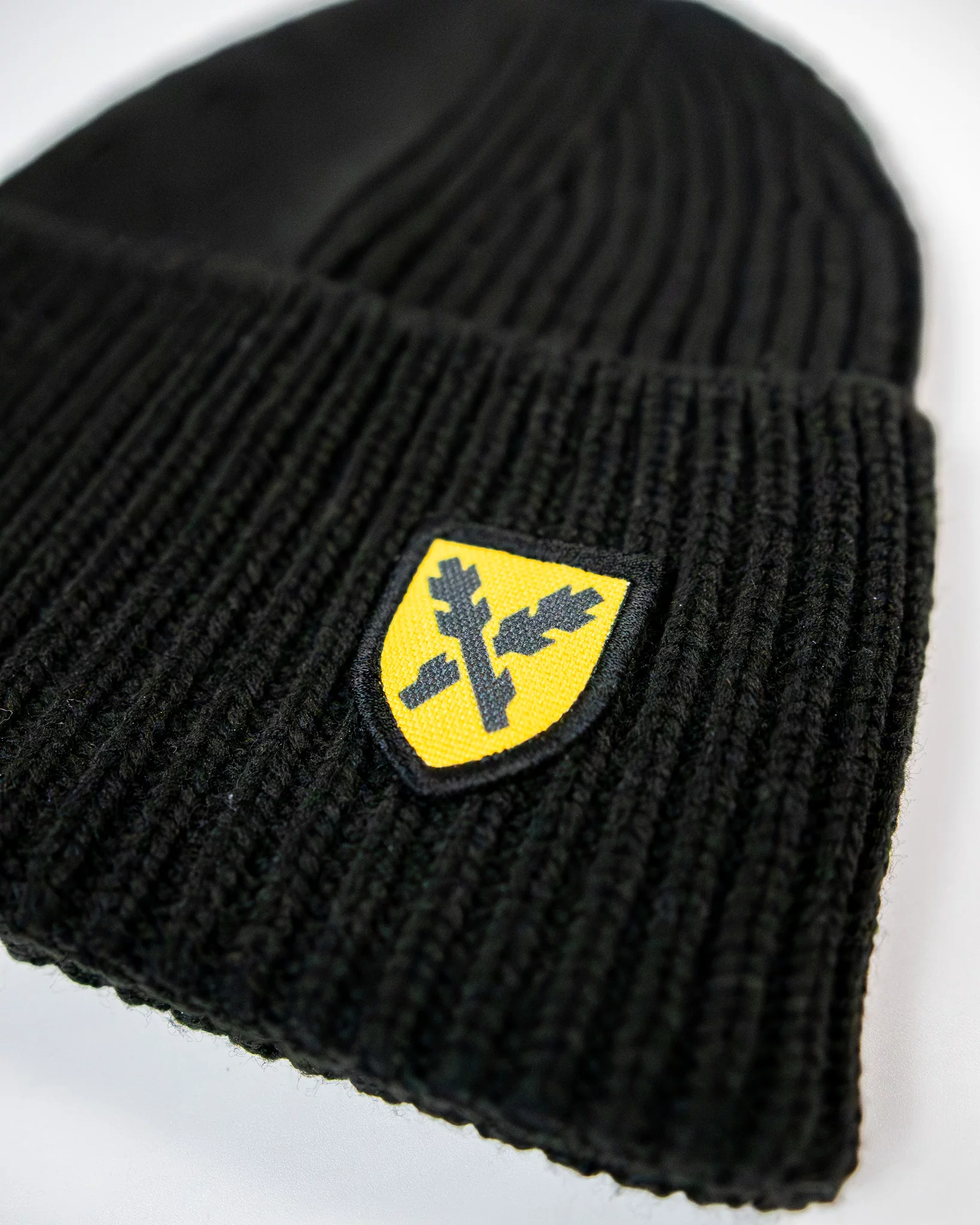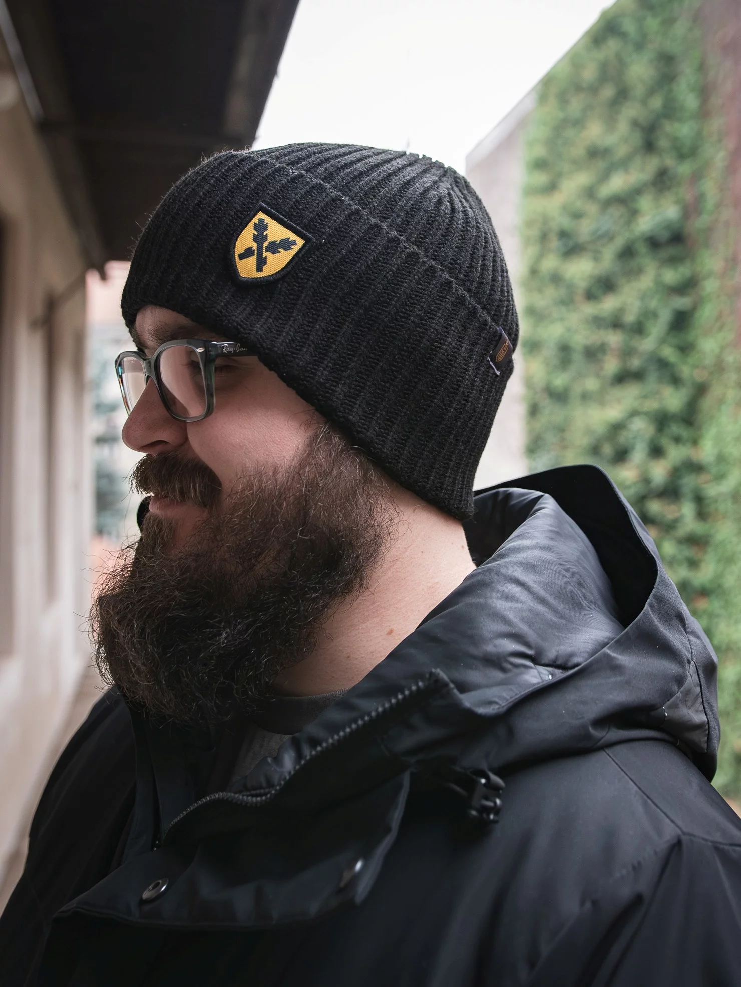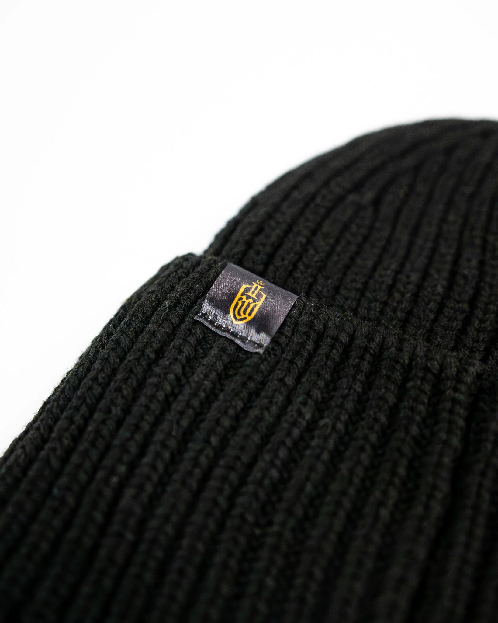 Kiedy nawet szlachetnie urodzonym doskwiera zimno, przydaje się czapka godna arystokraty. Elegancka, czarna czapka z naszywką herbu Jana Ptaszka z Pirksztajnu i dyskretną metką KCD II z tyłu. Wykonana z innowacyjnego materiału Polylana – zrównoważonej alternatywy dla wełny i akrylu, która łączy delikatność, ciepło i trwałość. Gruby ścieg żeberkowy chunky rib z szerokim mankietem idealnie utrzymuje kształt i zapewnia ciepło podczas każdego wyjazdu na przygodę z Ratajów.