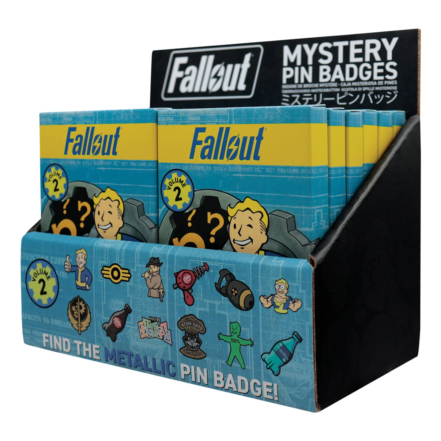 Każde pojedyncze pudełko zawiera losową metalową przypinkę z awersem pokrytym twardą emalią, rewersem w kolorze czarnego niklu i jednym z następujących wzorów: cztery różne wersje Vault Boya, logo Vault-Tec, logo Bractwa Stali (Brotherhood of Steel), logo Atom Cats, grafikę You’re Special, butelkę Nuka-Coli, pistolet Nuka-Cola Thirst Zapper, bombę atomową lub tę najbardziej pożądaną – metalicznie niebieską butelkę Nuka-Cola Quantum.