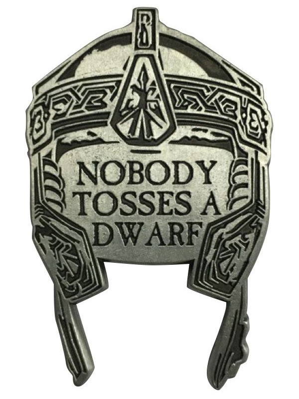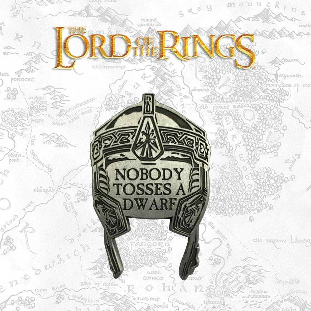 Kolekcjonerska przypinka z humorystycznym cytatem Nobody Tosses a Dwarf z Władcy Pierścieni (The Lord of the Rings) w kształcie hełmu Gimliego została wydana przez firmę Fanattik. Przypinka jest limitowana do 9995 sztuk na całym świecie, tłoczona z obu stron, a każdy egzemplarz jest unikalnie numerowany. Zapakowana w kolekcjonerski blister.