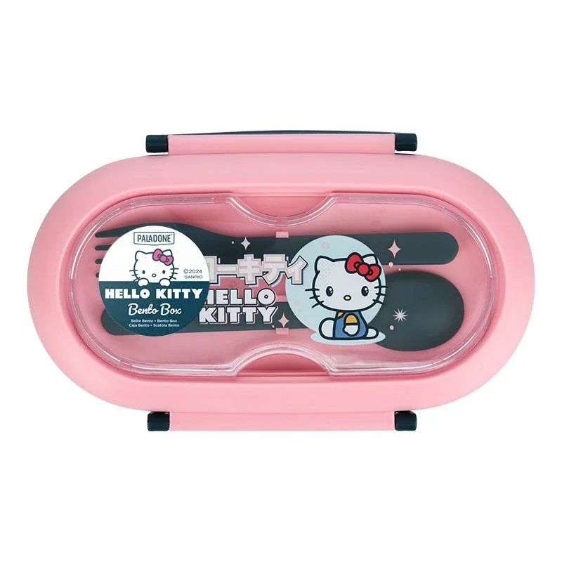 Ten stylowy lunch box (bento box) w różowym wydaniu jest idealny do przechowywania kanapek, owoców lub ulubionych smakołyków. Wewnątrz znajdziesz praktyczną przegródkę i zestaw sztućców – widelec i łyżkę – ukryty pod przezroczystą pokrywką z motywem Hello Kitty. Dzięki solidnym klipsom wszystko pozostanie bezpiecznie zamknięte i świeże przez cały dzień. Świetnie nadaje się do szkoły, pracy i na piknik.