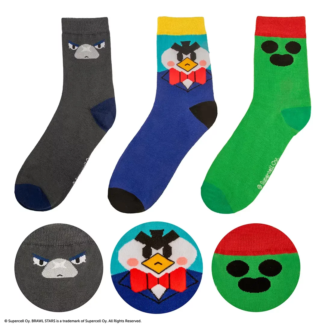 Wnieś do swojej garderoby odrobinę gamingowej energii. Ten zestaw trzech par skarpetek z Brawl Stars przedstawia troje ulubionych wojowników: Spike’a, Crowa i Pana P., każdy z własnym wyrazistym wzorem.