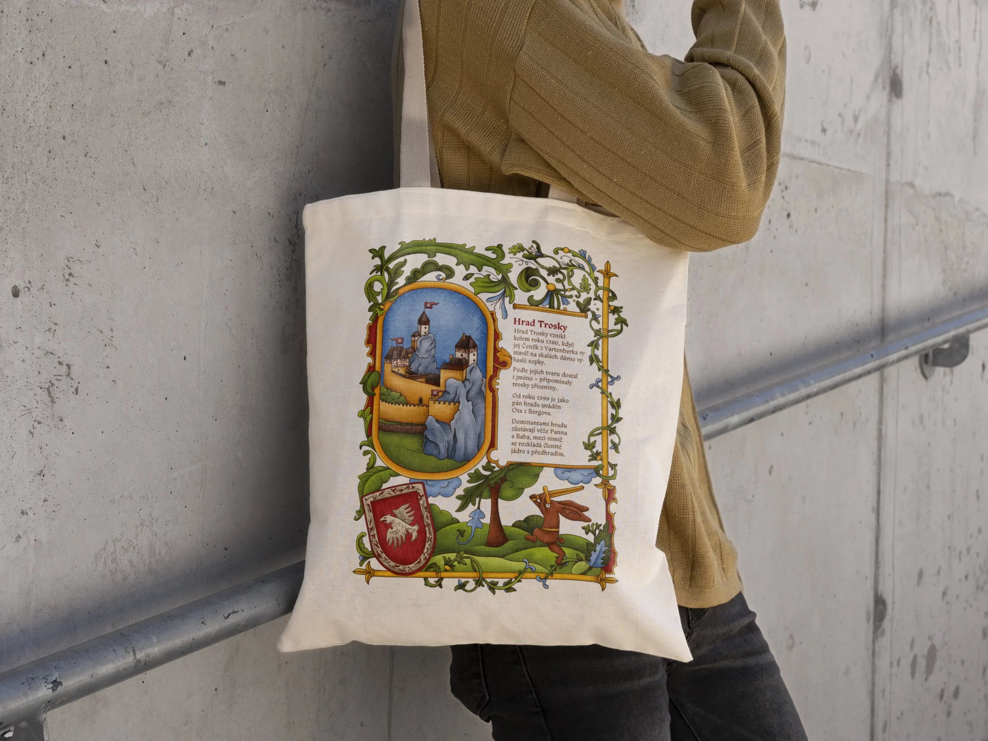 Płócienna torba z iluminowanym motywem zamku Trosky przypomina średniowieczne manuskrypty i ukazuje piękno oraz historię tej kultowej ruiny, która ożywa w świecie Kingdom Come: Deliverance II.
