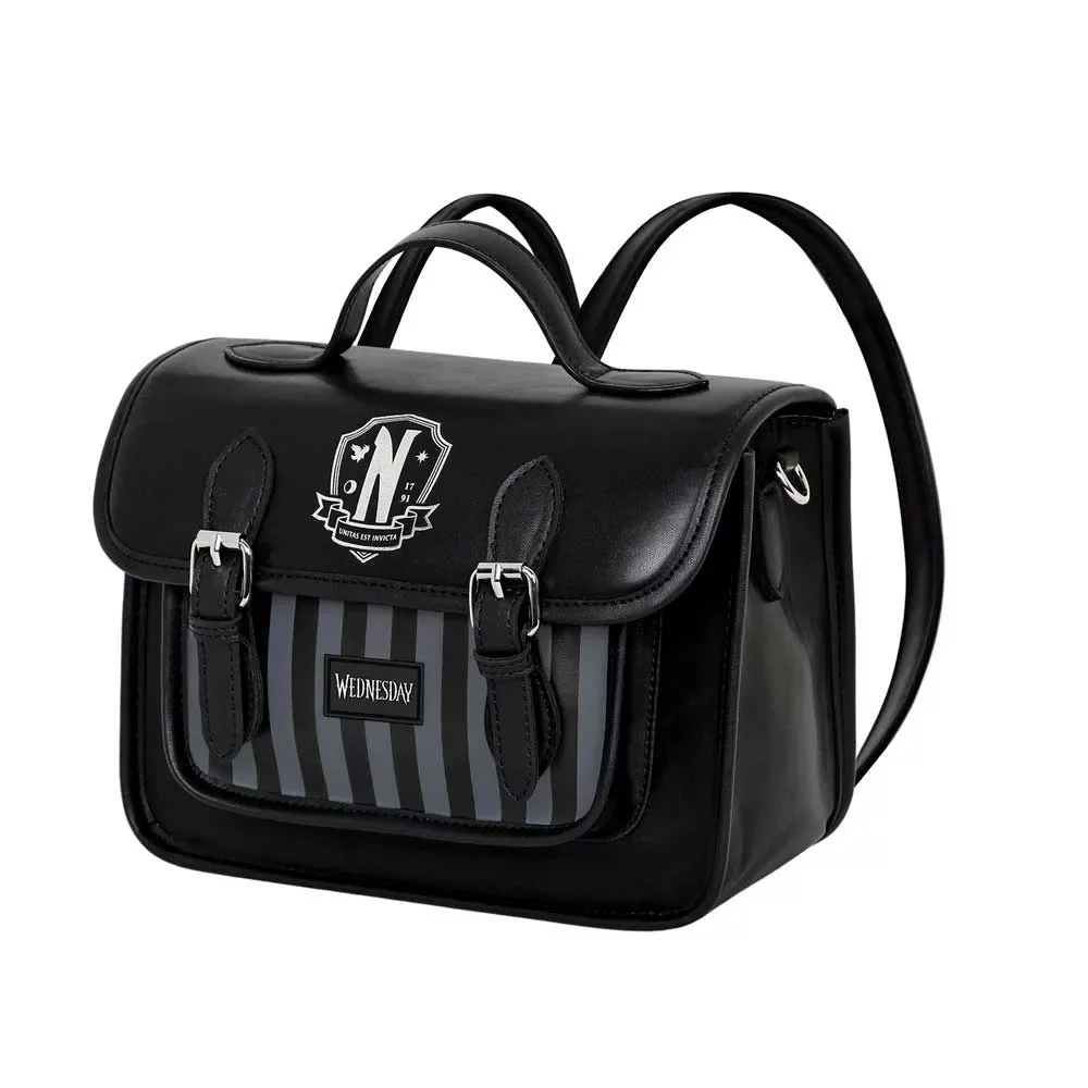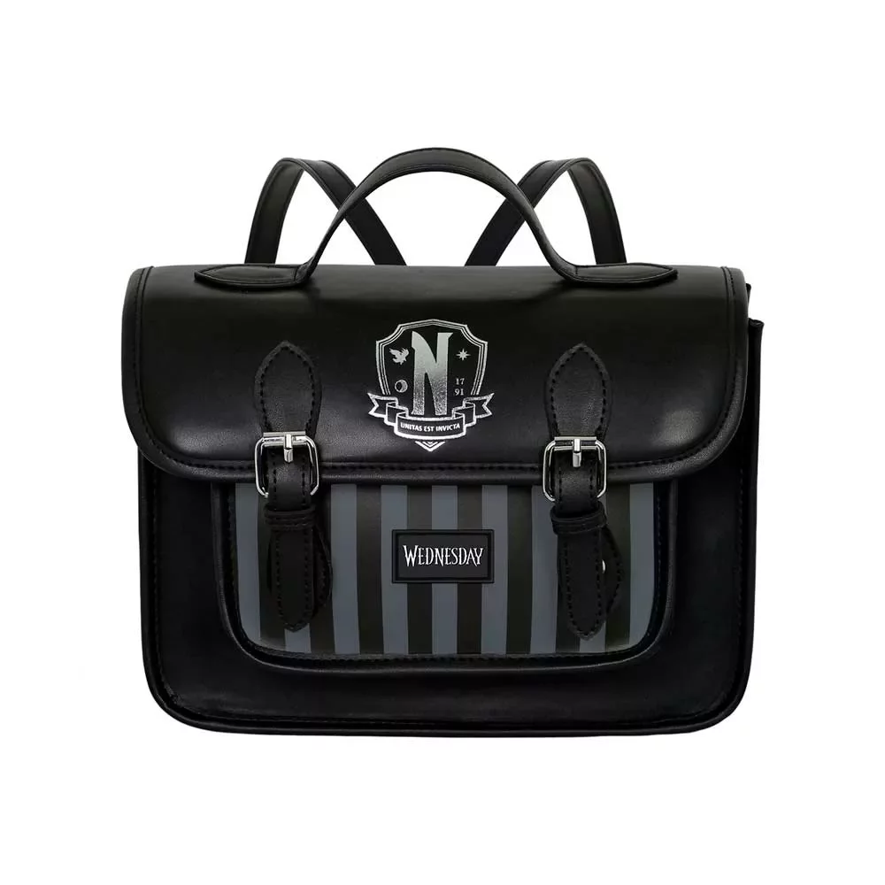 Torebka dla fanów hitu Netflixa Wednesday, którą zdobi herb szkoły Nevermore. Torebka ma wymienne regulowane paski, dzięki którym możesz wybrać, czy chcesz ją nosić jako klasyczny plecak czy torebkę. Torebka ma główną komorę na zamek błyskawiczny, przednią kieszeń, klapę z magnetycznym zapięciem oraz wewnętrzną podszewkę z dodatkowymi przegrodami.