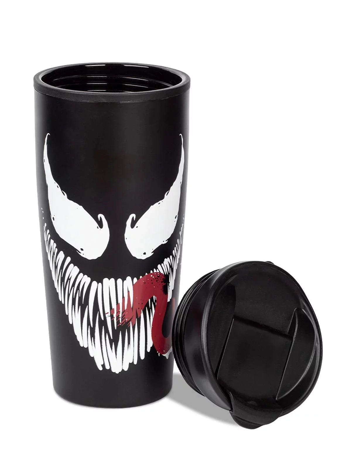 Venom kubek podróżny - Fani Venom z pewnością polubią tego klasycznego kubka z twarzą symbionta. Kubek podróżny to świetna rzecz, gdy nie chcesz wylać gorącej kawy na kolana i spalić rąk kiedy jedziesz samochodem. Wnętrze kubka jest oddzielone warstwą izolacyjną, dzięki czemu zachowuje napój bardzo gorący. Ponadto kubek ma własne zamknięcie, więc nie ma niebezpieczeństwa rozlania. Objętość kubka wynosi około 425 ml.