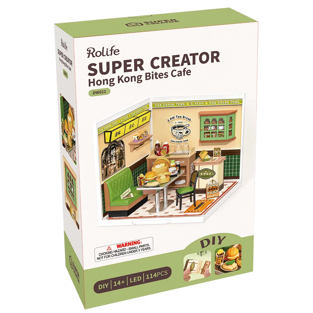 Szczegółowo dopracowana miniatura domku DIY inspirowana kultową kulturą herbacianą Hongkongu, która oddaje lokalne specjały, stylowe wnętrze oraz modułowy design z serii Rolife Super Creator, umożliwiający łączenie zestawów.Wymiary: 163 x 176 x 152 mm