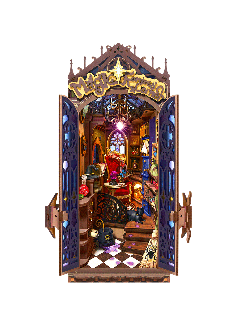 Wprowadź do swojej biblioteczki odrobinę magii dzięki temu zachwycającemu zestawowi, który otwiera drzwi do świata pełnego tajemnic i fantazji. The Magic Fantasy Corner to kolorowy i fantazyjny book nook, który oczarowuje dopracowanymi detalami inspirowanymi stylem neogotyckim i światem czarodziejów.