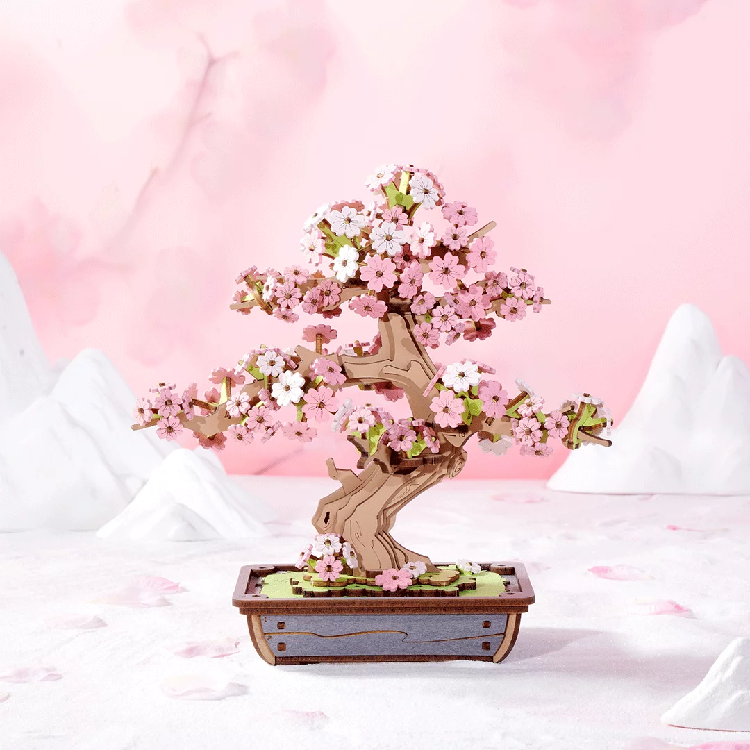 Subtelne piękno kwitnącej wiśni, która nigdy nie zwiędnie. Drewniany zestaw konstrukcyjny Sakura Bonsai pozwoli Ci stworzyć własne eleganckie drzewko pełne różowych kwiatów, które wprowadzi do wnętrza spokojną i harmonijną atmosferę.
