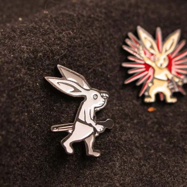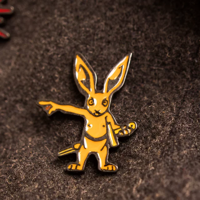 Zestaw trzech emaliowanych znaczków z niemal kultowymi zającami ze średniowiecznej gry RPG Kingdom Come: Deliverance II. Zające w grze służą jako oryginalny wskaźnik statusu, informujący, czy Jindra został wykryty, wrogowie go szukają, czy też jest w trakcie walki.